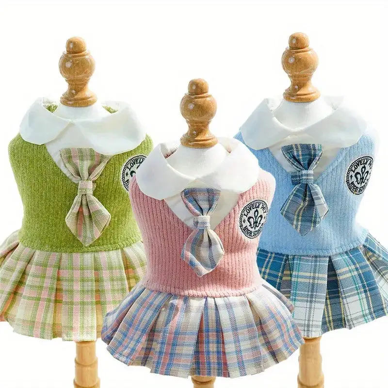 Small Plaid Pullover Dog Dress All-Season Polyester Dog Dress, Chic College Style Pet Apparel, with Plaid Skirt and Collar, Pullover Design, for Small Breeds, Ideal for Spring, Cat & Chihuahua, Available in Pink, Blue, Green