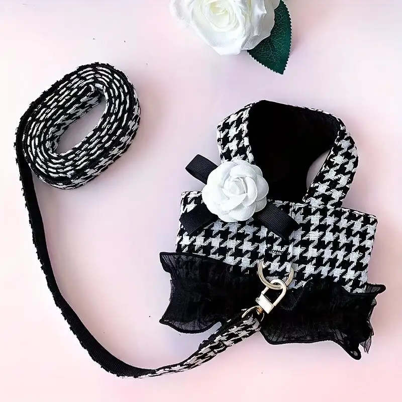 Pet Houndstooth Clothes Dog And Cat Dress With Flower Decor Can Hang Traction Rope For Small Medium Pet Traction Skirt