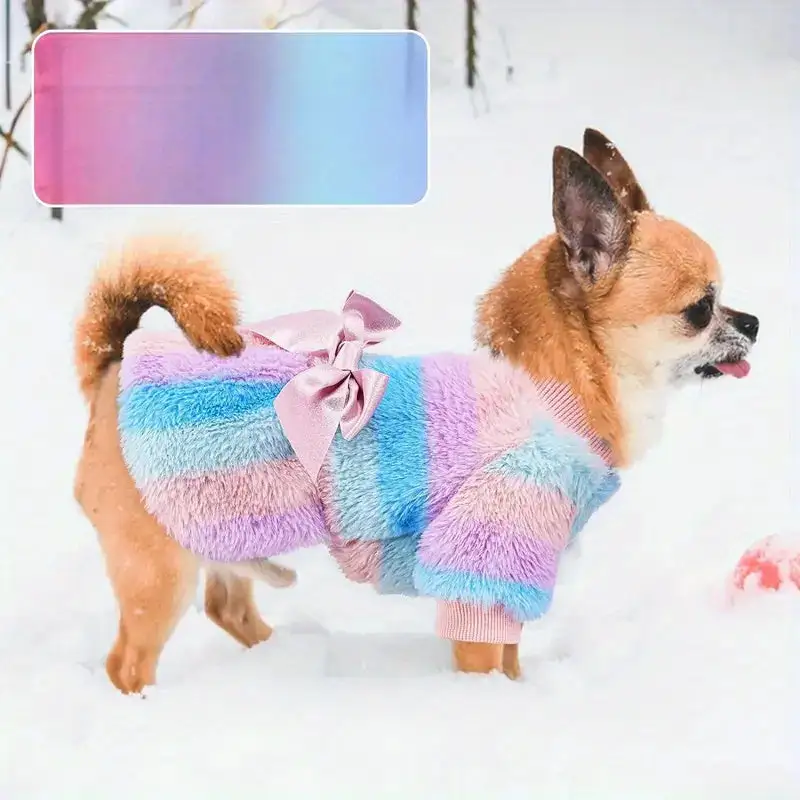 Rainbow Stripe Plush Princess Dog Dress for Small Dogs Girl Winter Puppy Cat Sweater Clothes Warm Fleece Pet Dress Bowknot Skirt