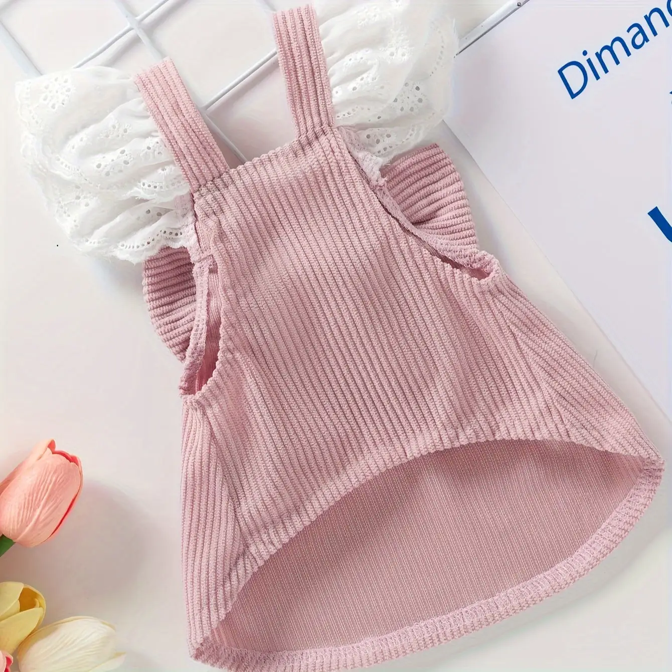 1pc Polyester Corduroy Pet Princess Dress with Lace Sleeves, Bow and Leash Ring - All-Season Pullover for Small Breeds, Autumn and Winter