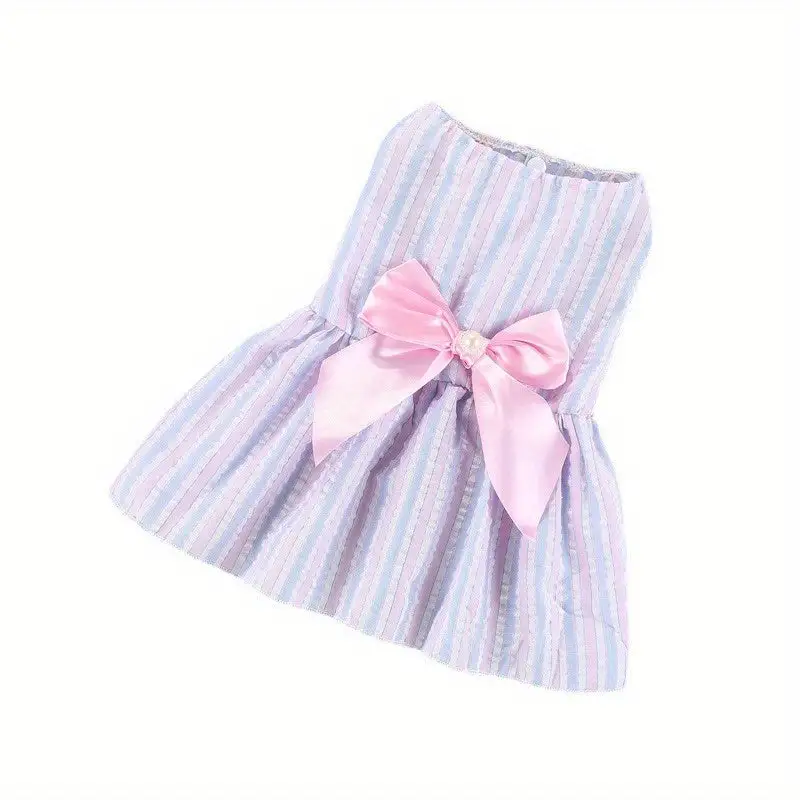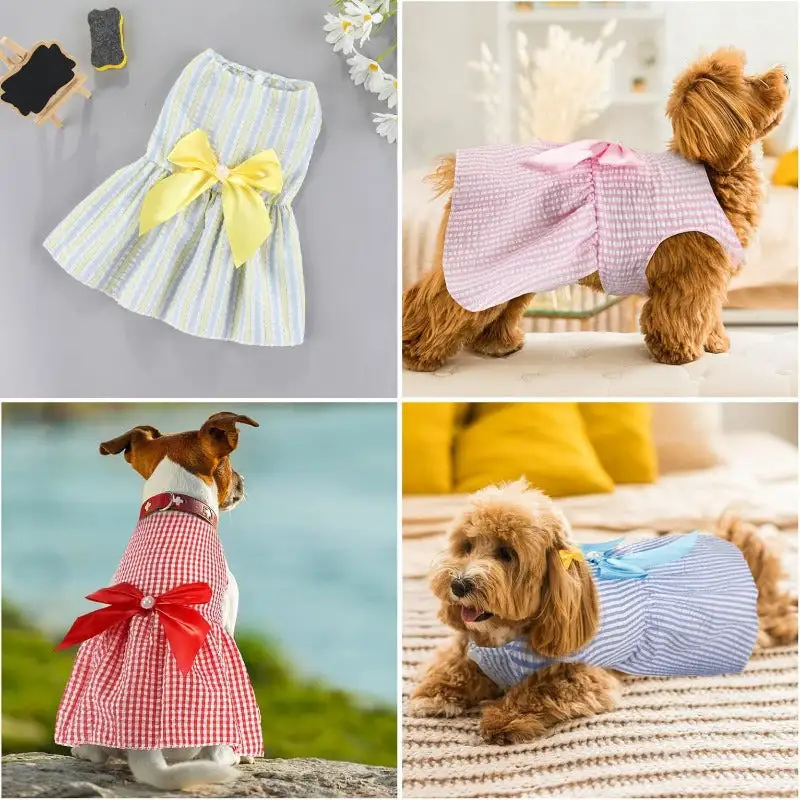 5pcs Cute Striped Pet Dresses with Bow - Spring\u002FSummer Dog & Cat Party Outfits for Yorkies, Chihuahuas & Small Breeds - Pastel Colors, Gingham Patterns, Polyester Material, Pet Clothes