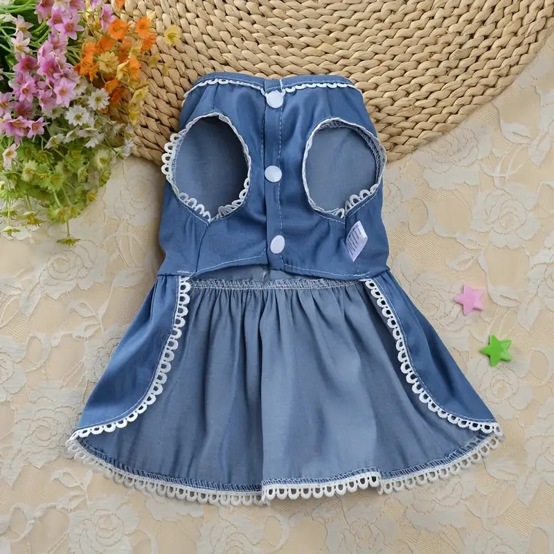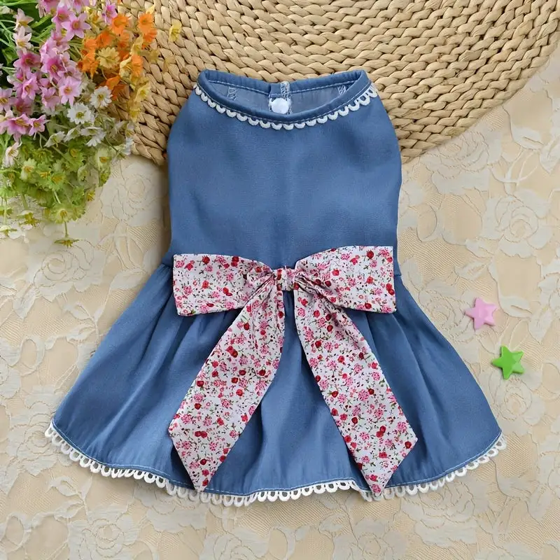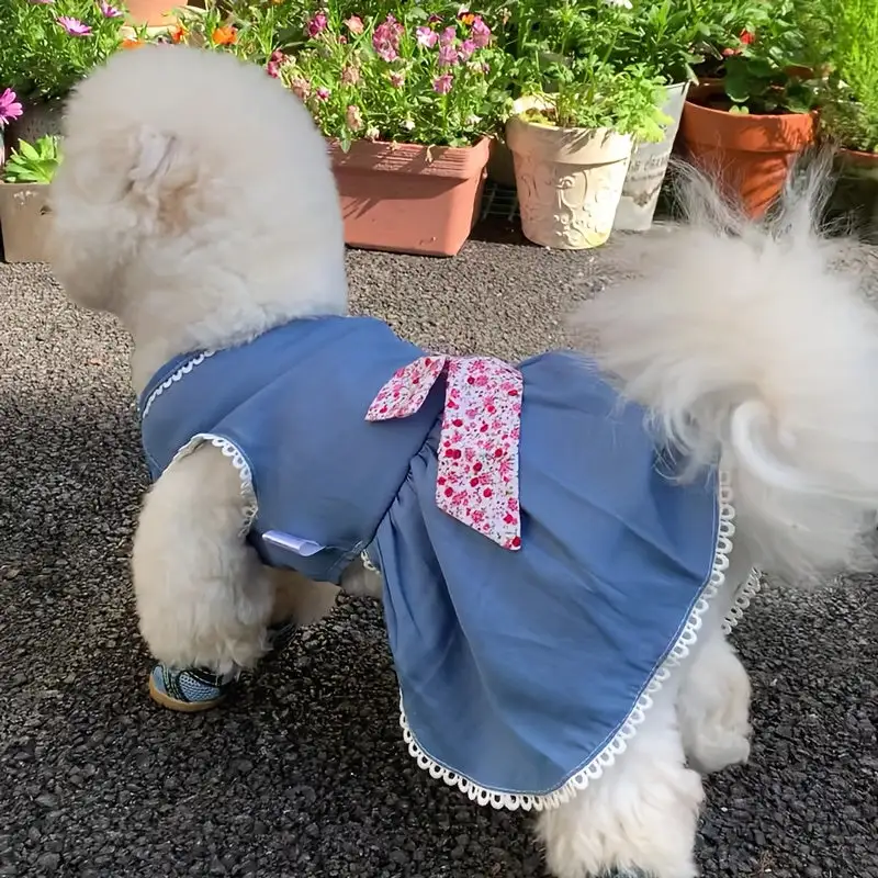 Breathable Denim Dog Dress with Floral Bow - Navy Blue Princess Skirt for Small to Extra Small Breeds, Perfect for Yorkies, Maltese, Poodles, Pomeranians, and Chihuahuas, Dog Clothes