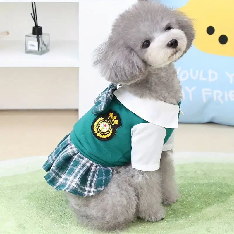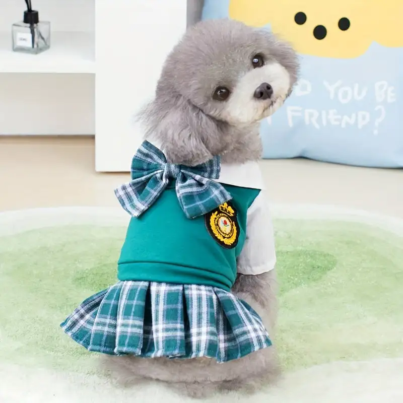 Chic Plaid Pet Couple Outfit: Green Vest with Bow & White Shirt Short Skirt Set - 100% Polyester, Machine Washable for Small to Extra Small Dogs - Ideal for Spring\u002FSummer, Dog Clothes