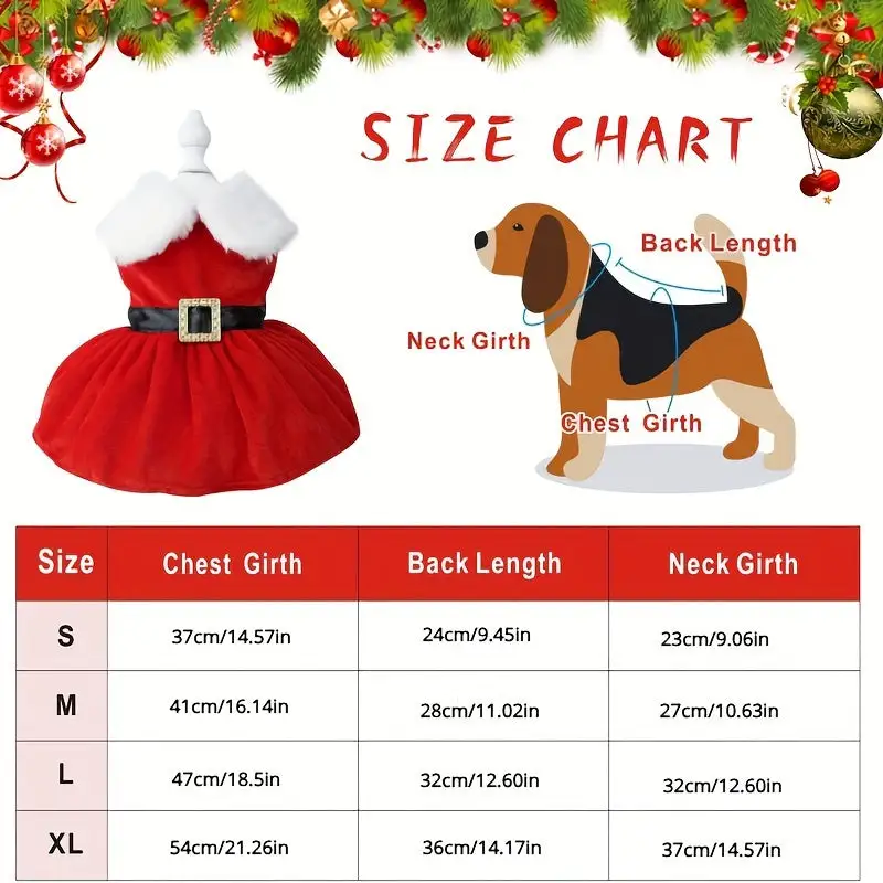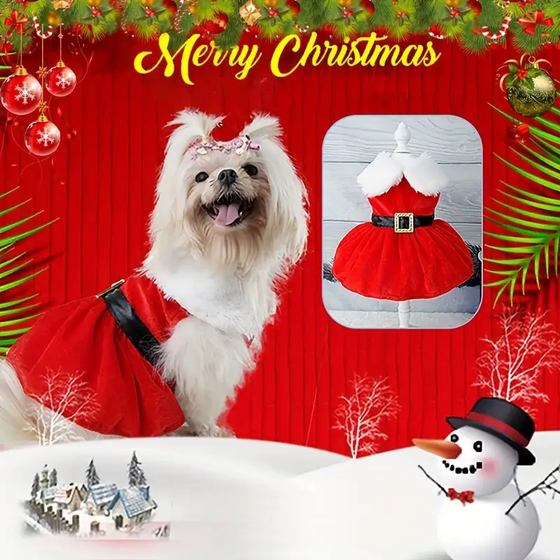 Christmas pet costume set with bow headband, red turtleneck dog and cat Christmas costumes, polyester woven fabric dress paired with net skirt hem, fashionable small dog holiday party attire