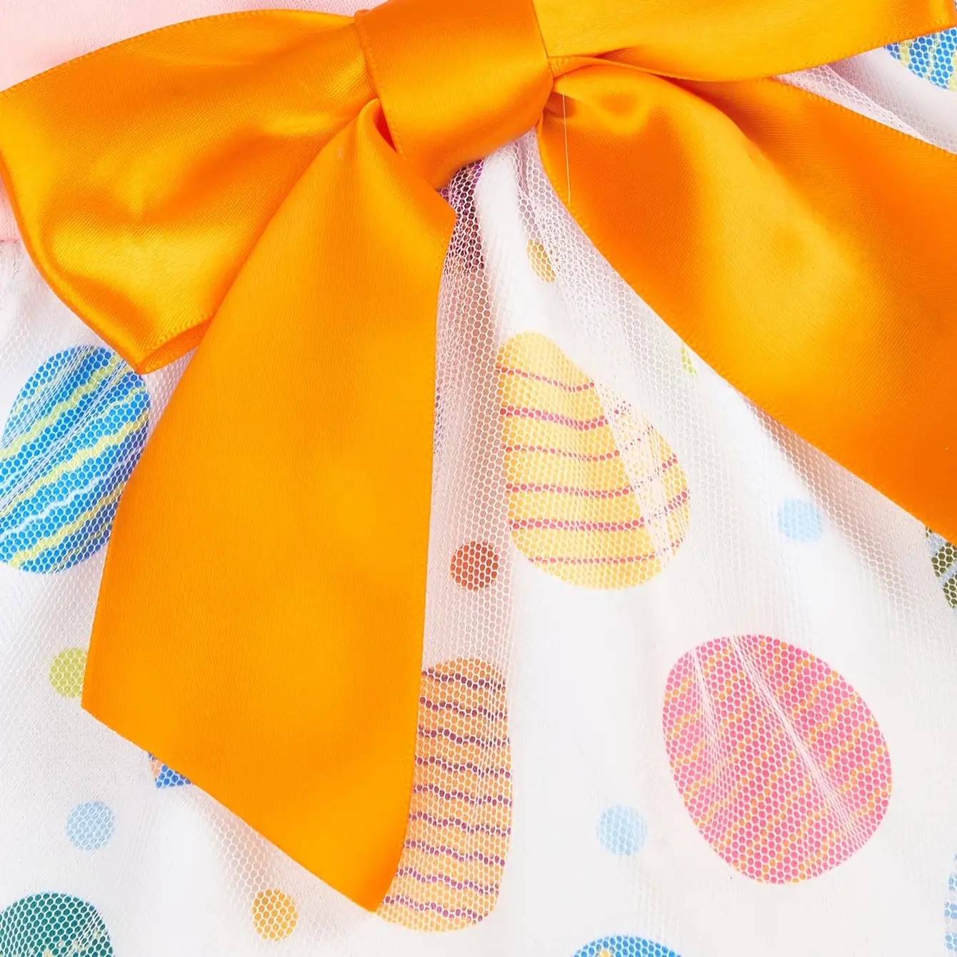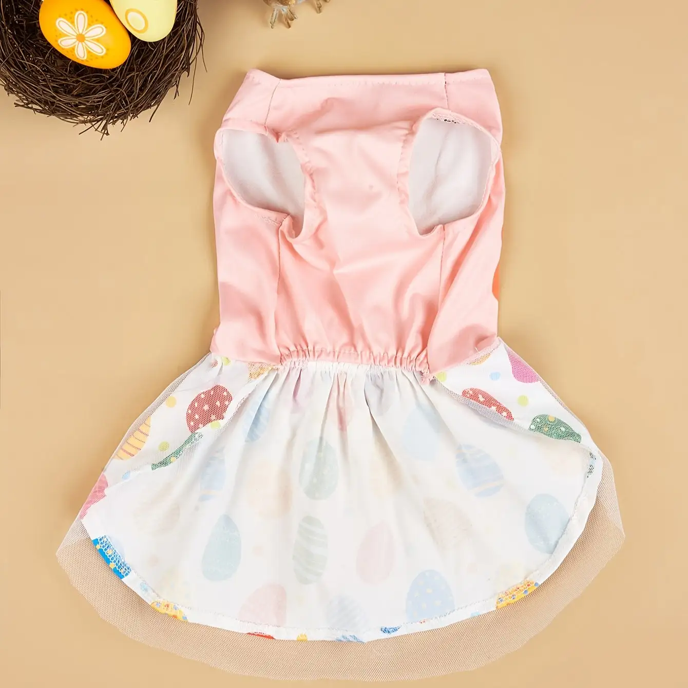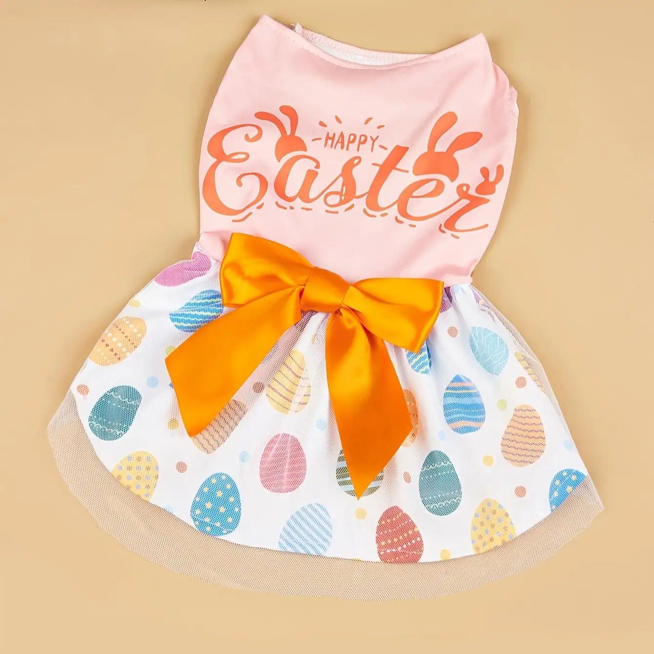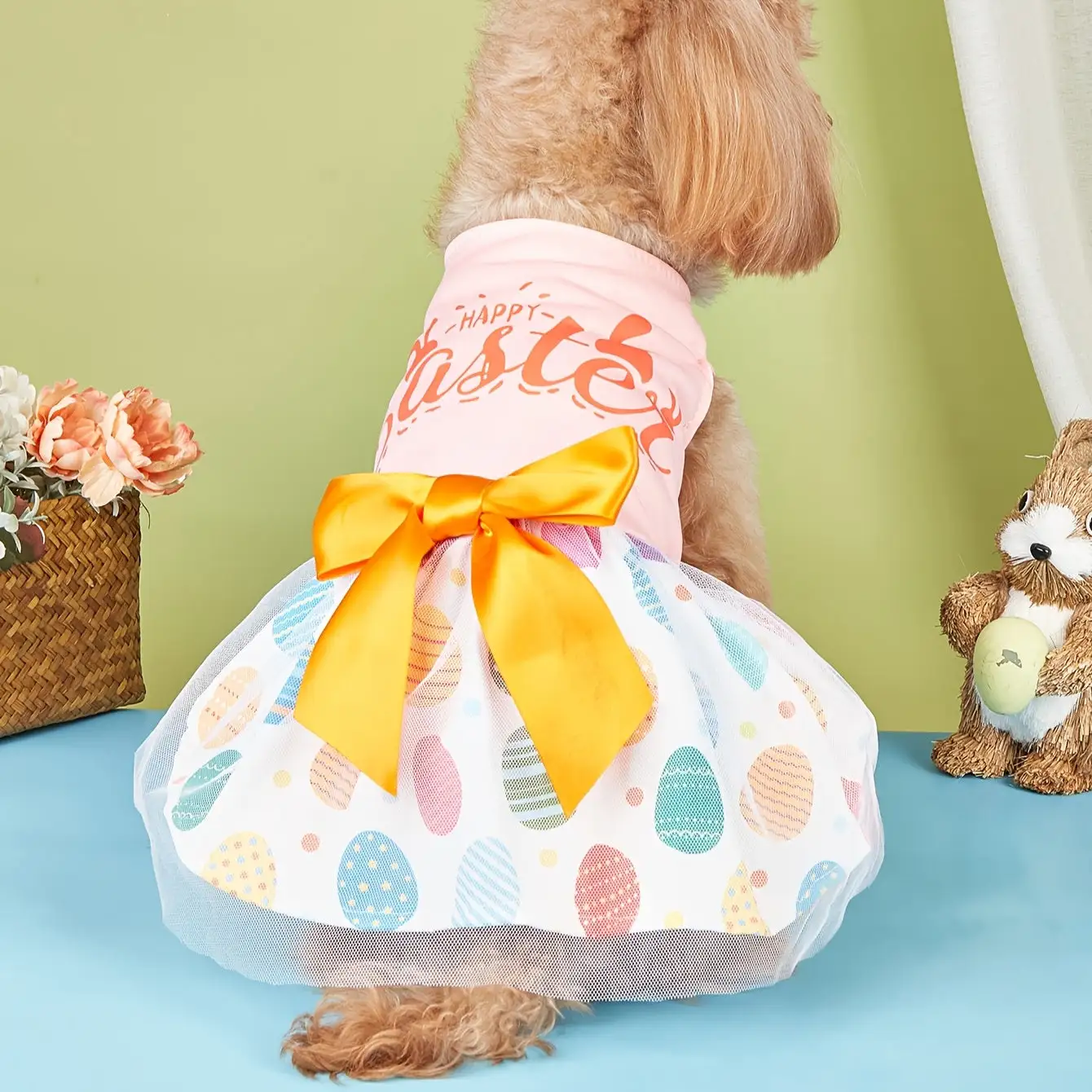 Easter Egg Pattern Dog Dress with Bowknot - 100% Polyester Knit Fabric, Machine Washable, Pullover Style Pet Apparel for Mini, Small, Medium Breeds - Spring\u002FSummer Season