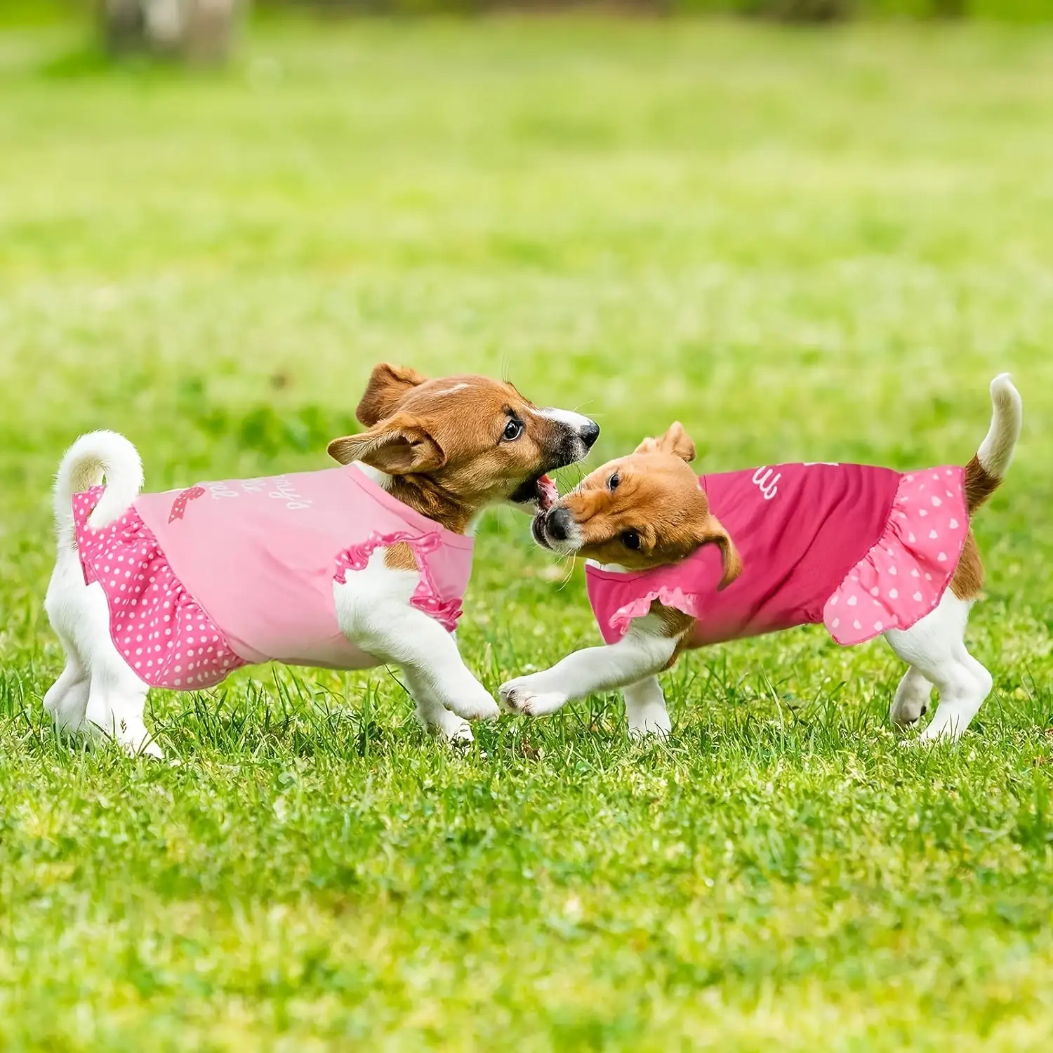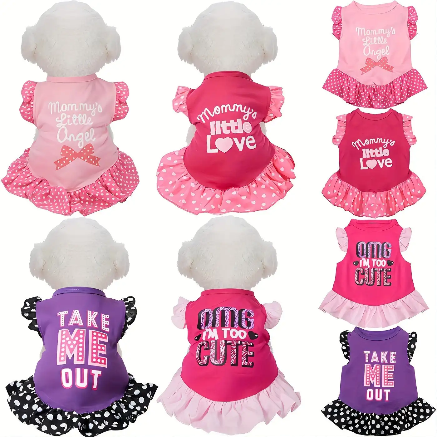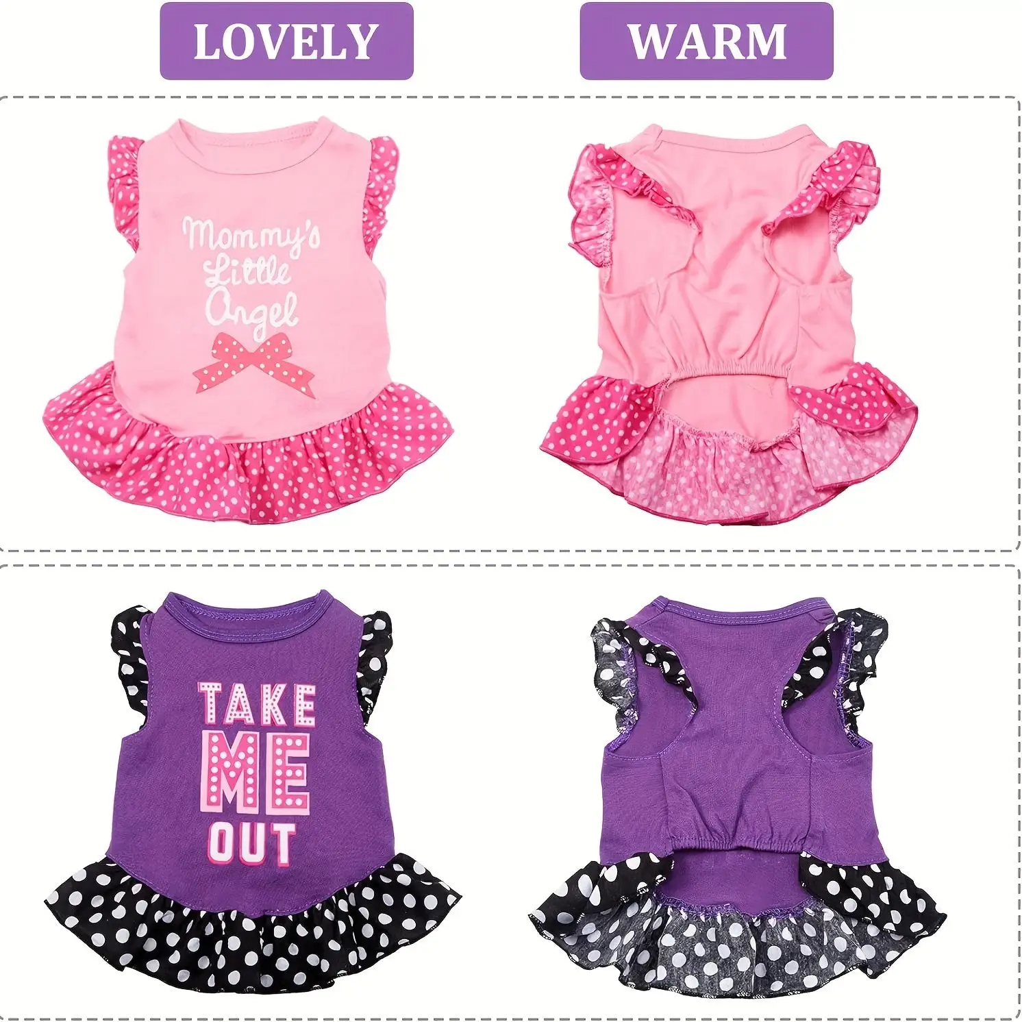 Four adorable dog dress shirts with ruffles - Pet sundresses made of soft and breathable fabric, featuring pink and purple polka dot patterns. They are suitable for small and medium-sized dogs and cats - Dog clothes that are perfect for all seasons.