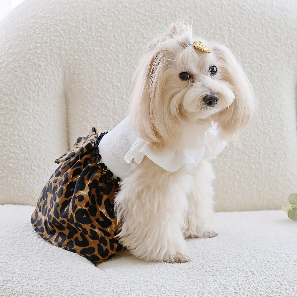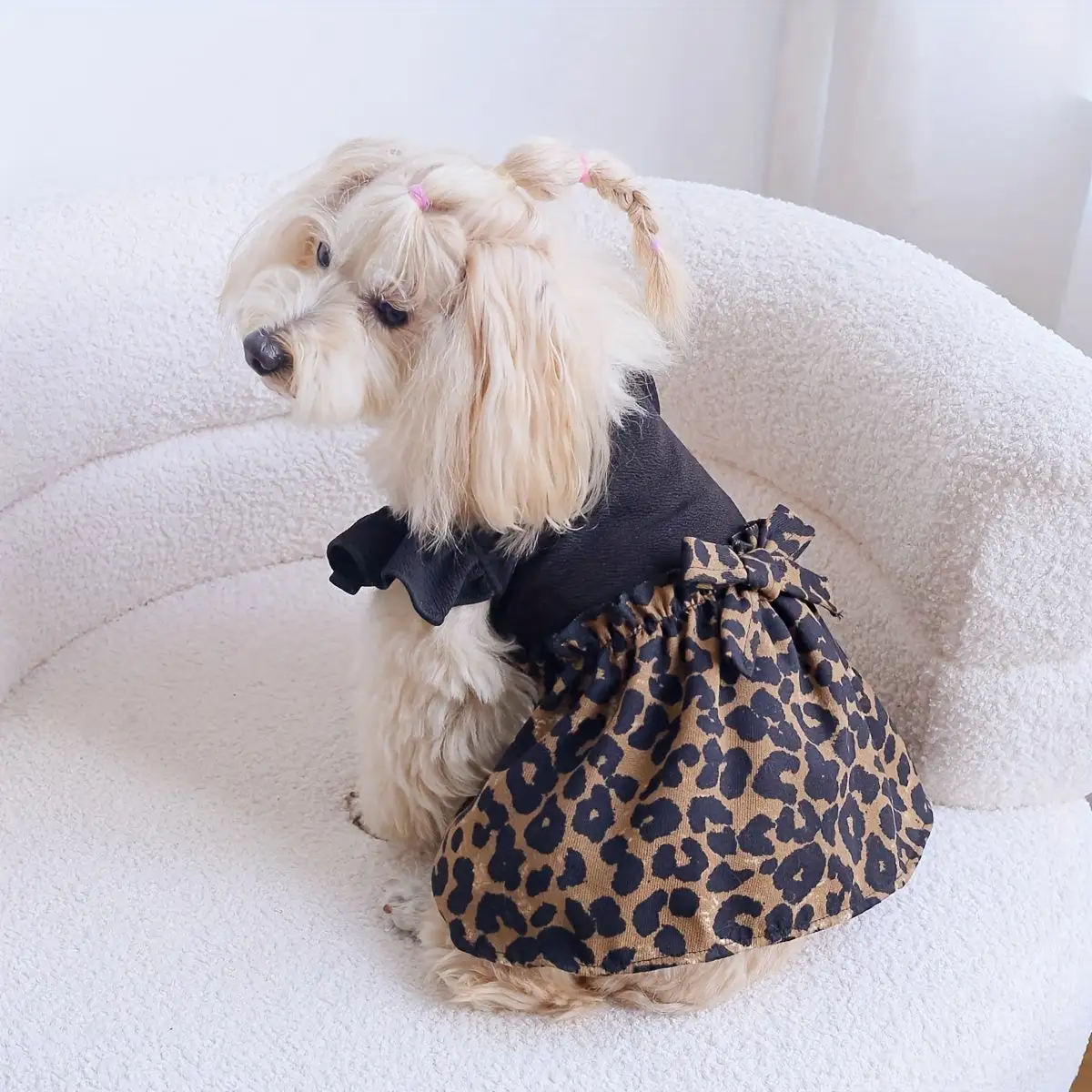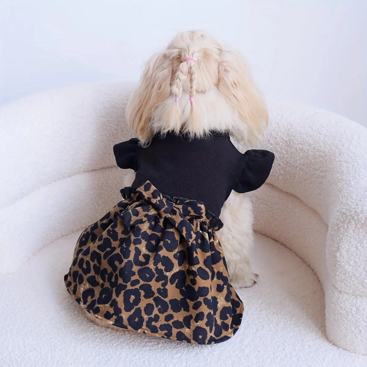 Pet Clothing Cat and Dog Four Seasons Bow Small Flying Sleeve Leopard Print Skirt Hem Splicing Elastic Fabric Flower Bud Dress 1pc