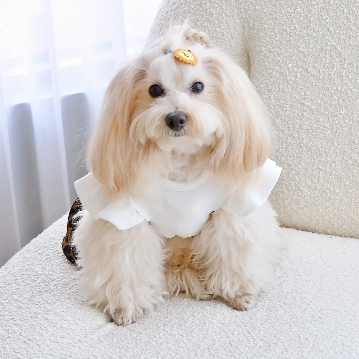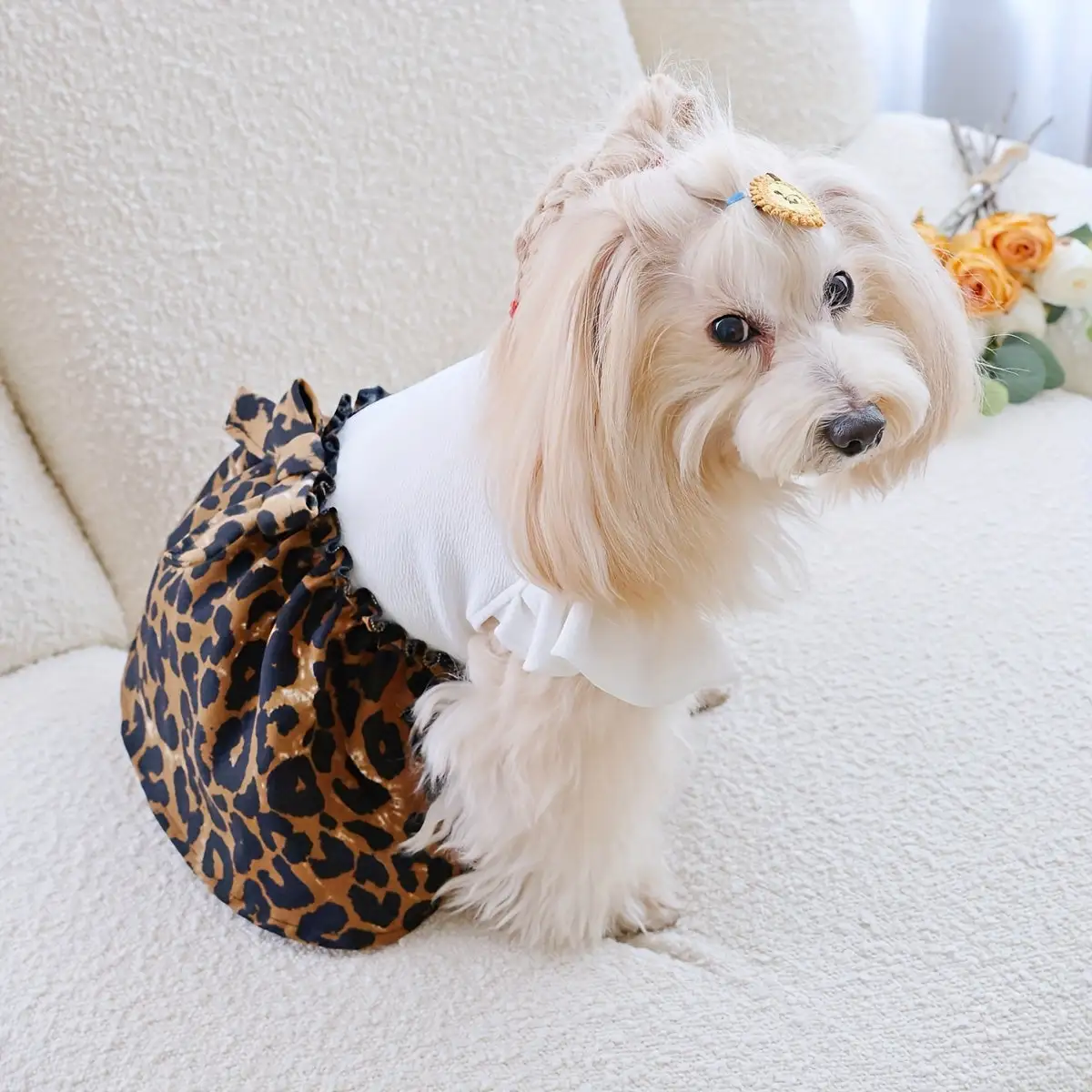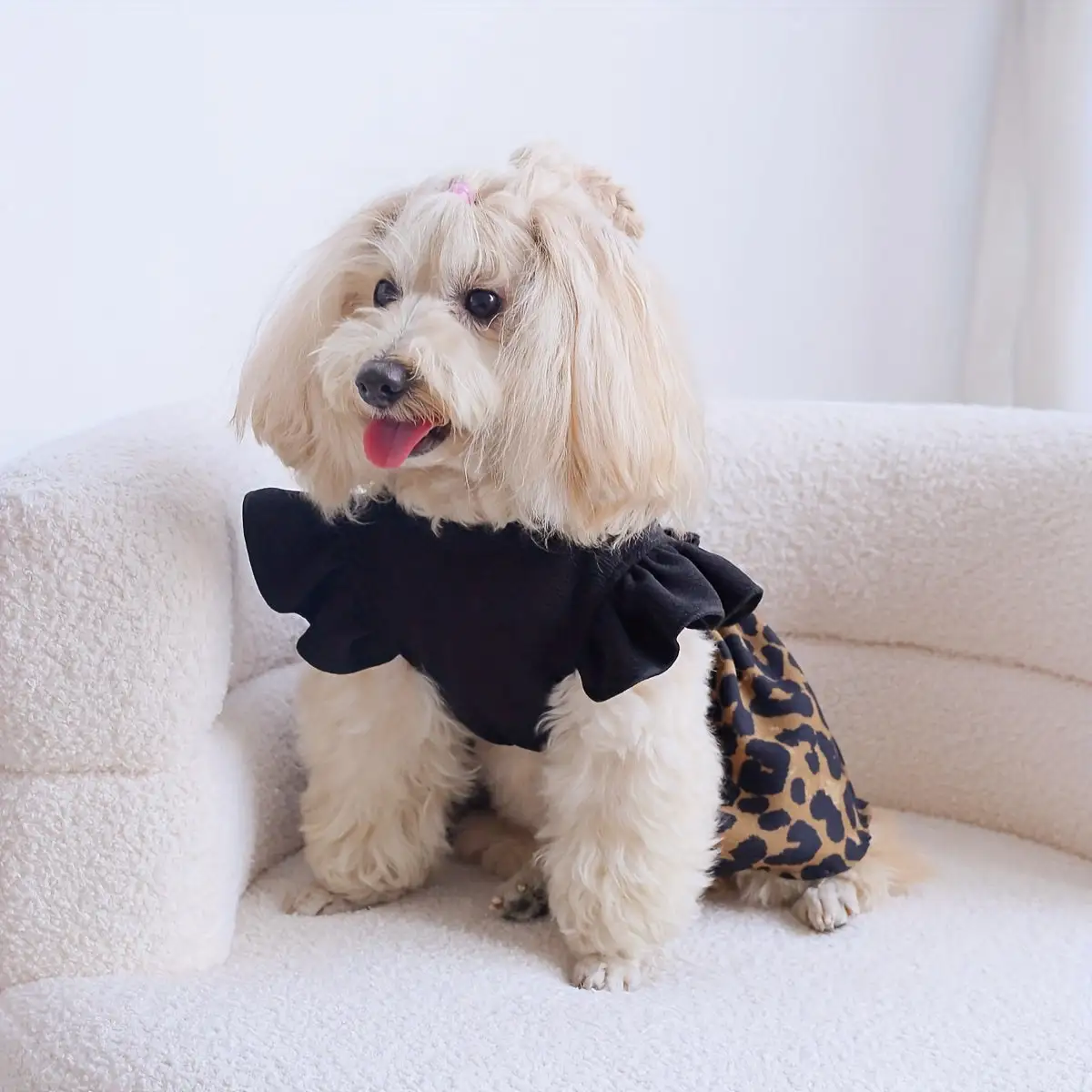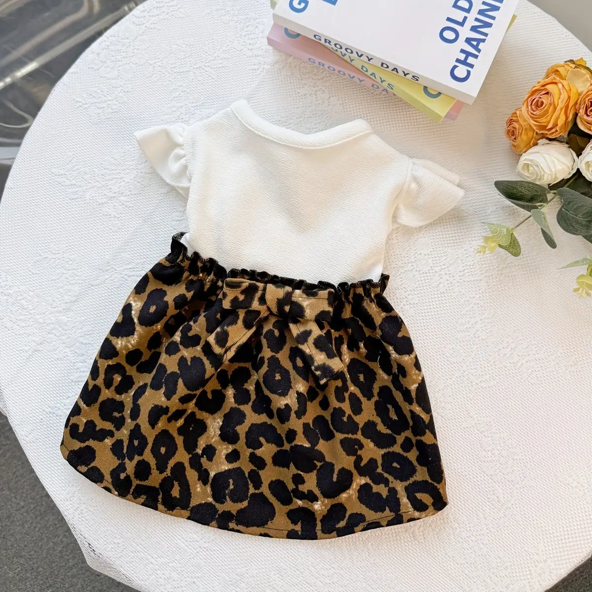 Pet Clothing Cat and Dog Four Seasons Bow Small Flying Sleeve Leopard Print Skirt Hem Splicing Elastic Fabric Flower Bud Dress 1pc