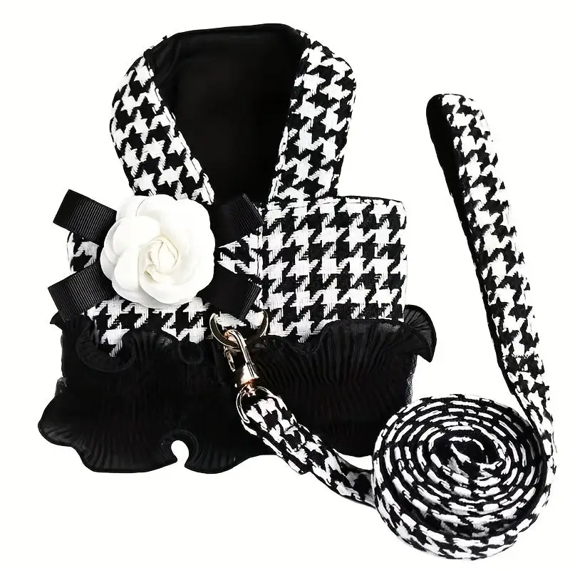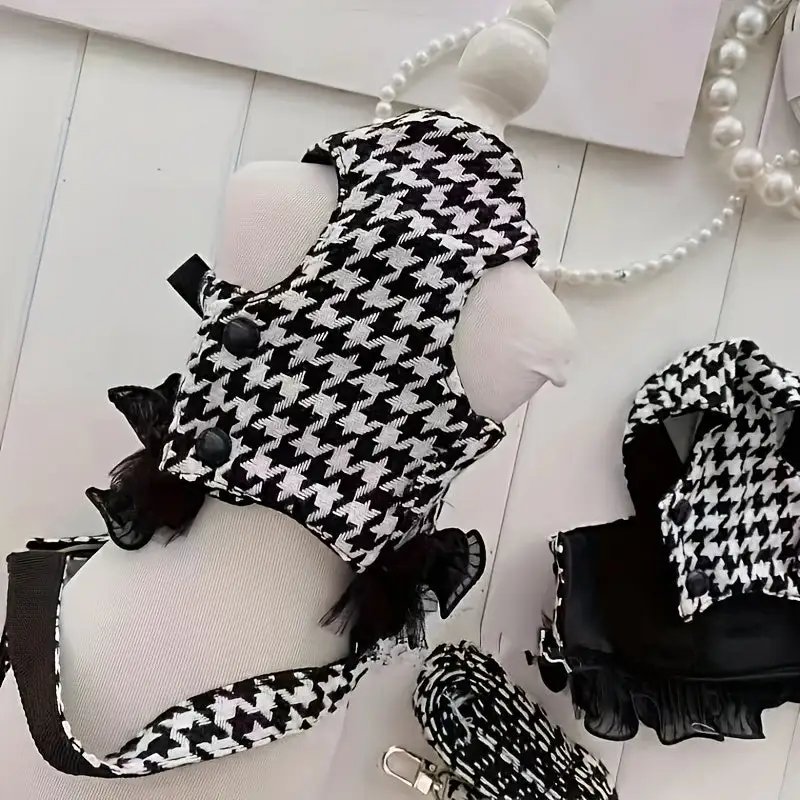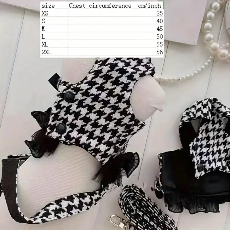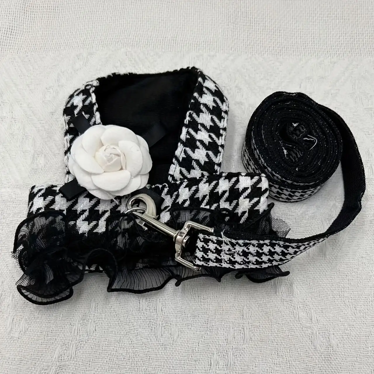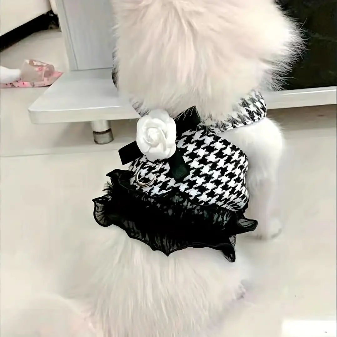 Pet Houndstooth Clothes Dog And Cat Dress With Flower Decor Can Hang Traction Rope For Small Medium Pet Traction Skirt