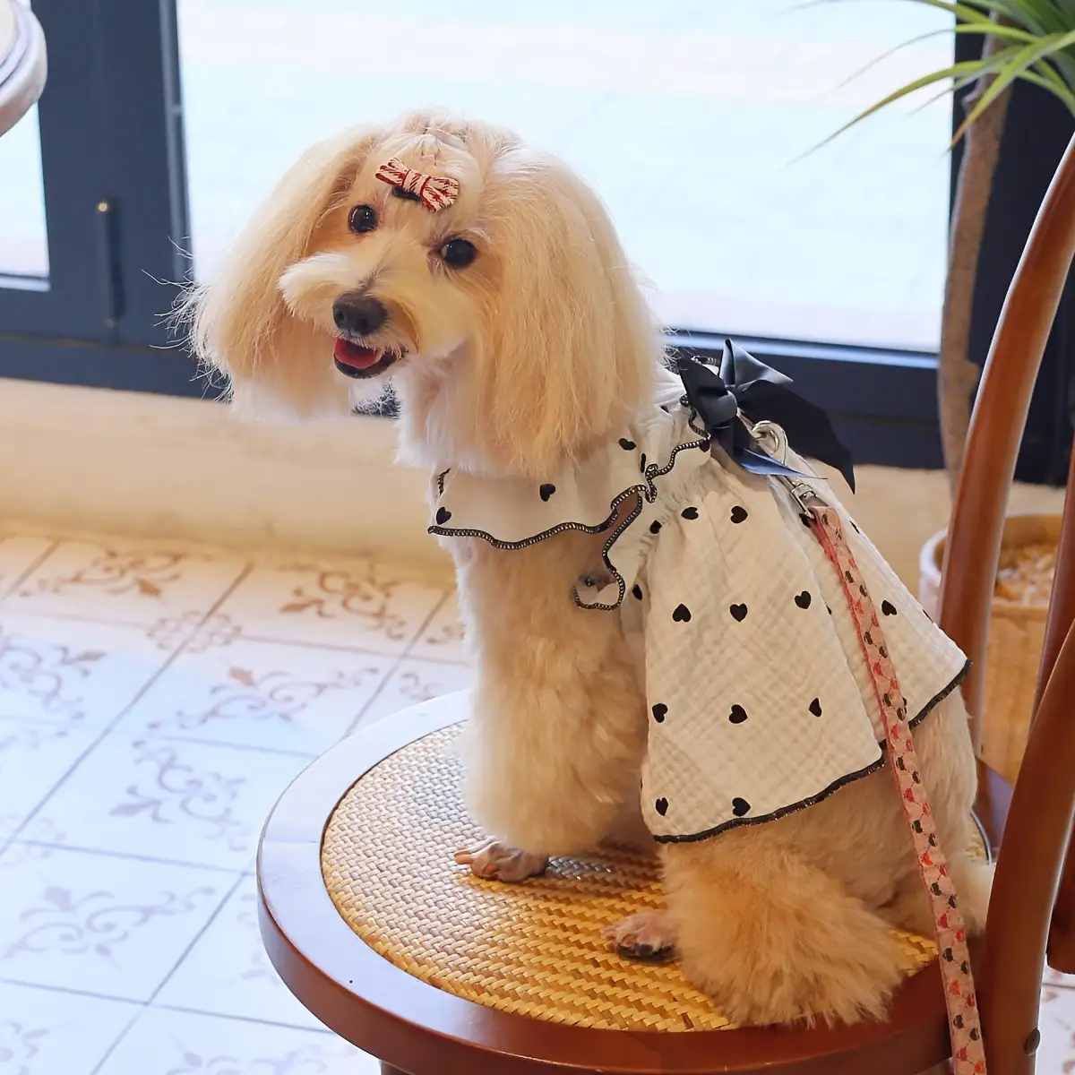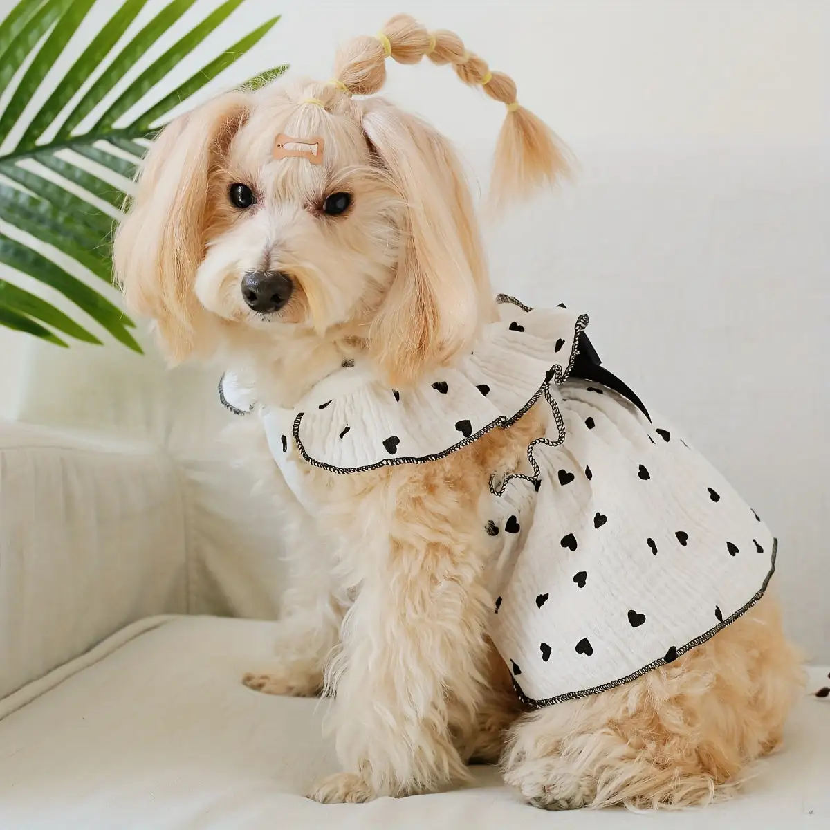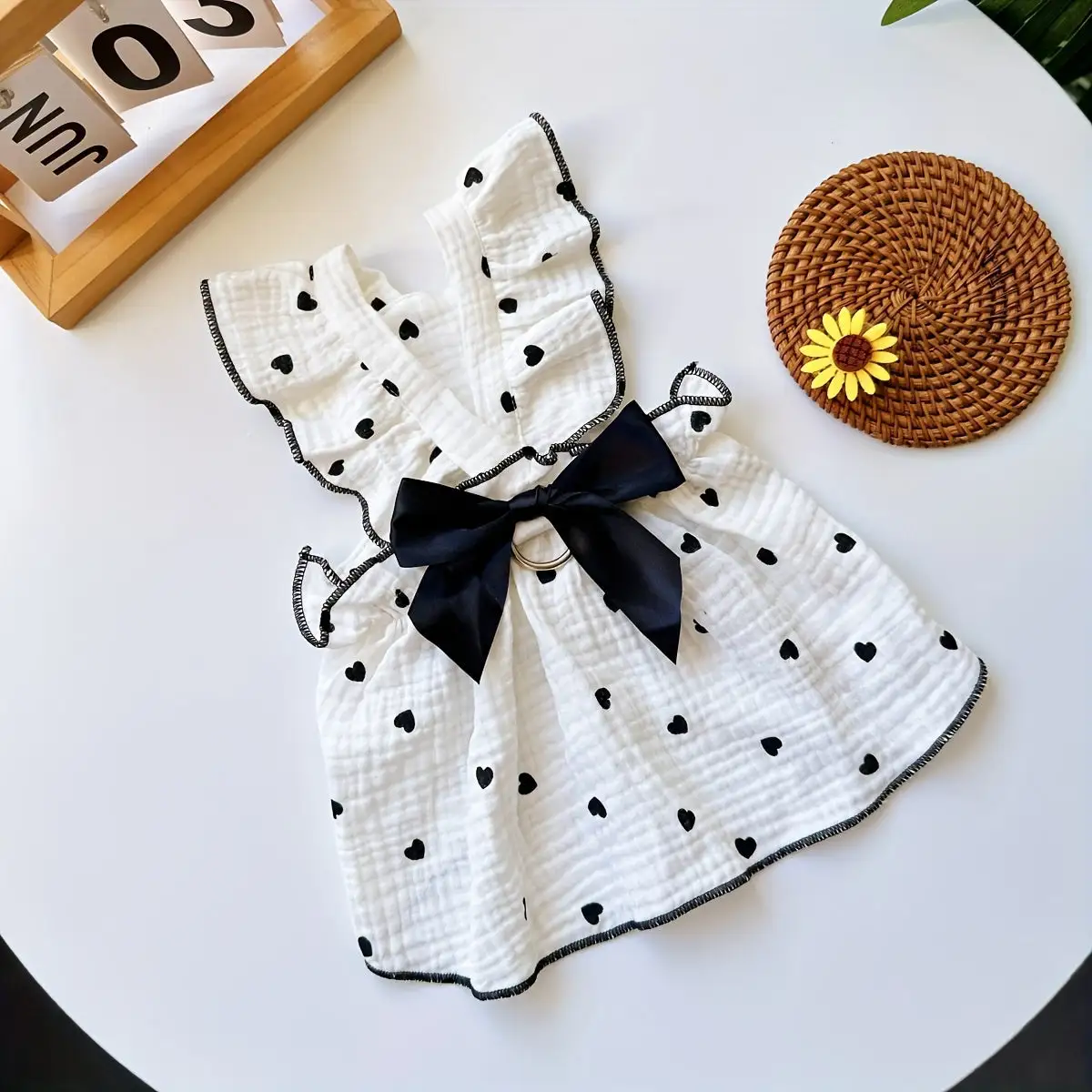 Polka Dot Heart Pet Dress with Detachable Bow and Leash Buckle - Hand Washable, All-Season Polyester Dog Dress for Small to Medium Breeds, Ruffle Hem Pullover Design for Home, Party, and Outdoor