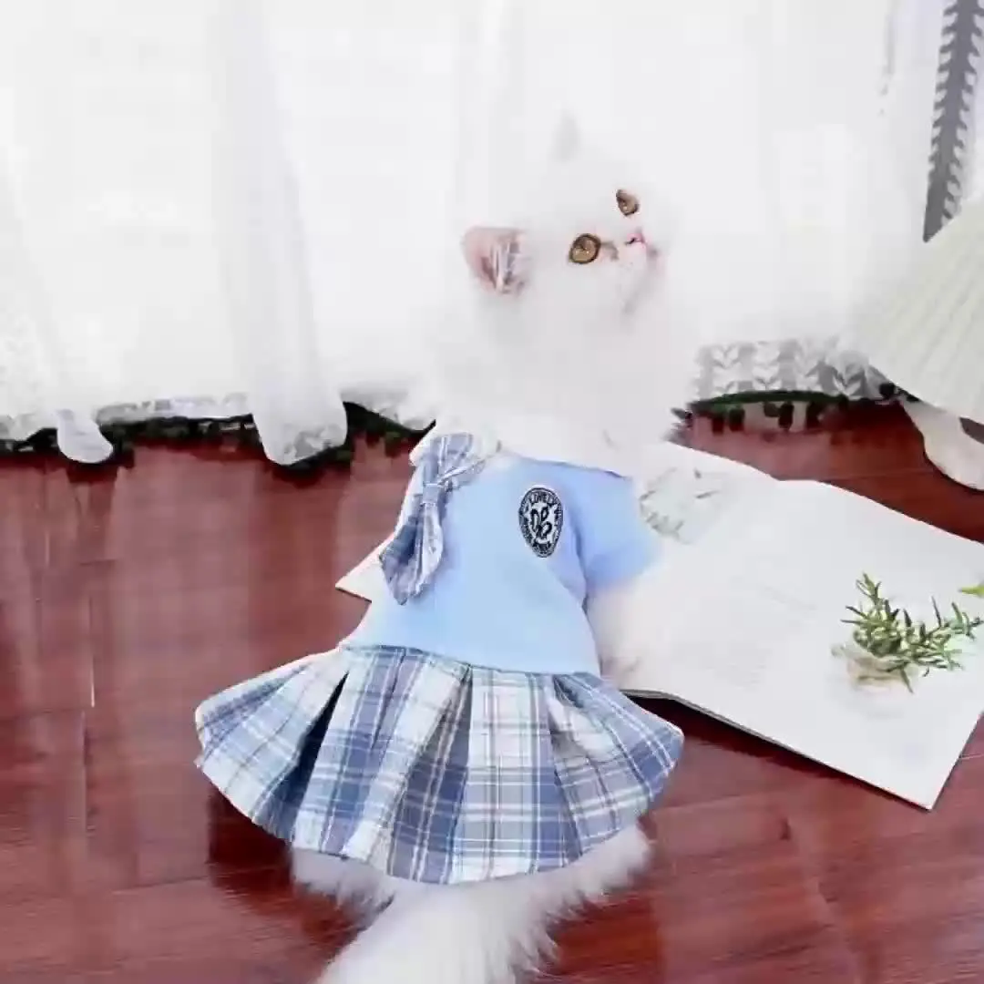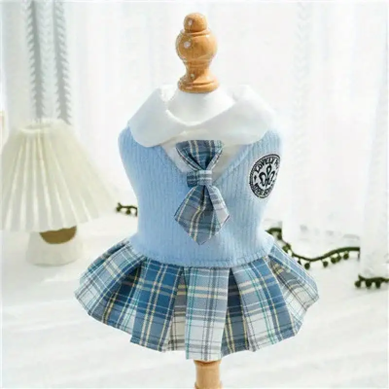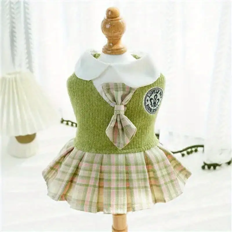 Small Plaid Pullover Dog Dress All-Season Polyester Dog Dress, Chic College Style Pet Apparel, with Plaid Skirt and Collar, Pullover Design, for Small Breeds, Ideal for Spring, Cat & Chihuahua, Available in Pink, Blue, Green